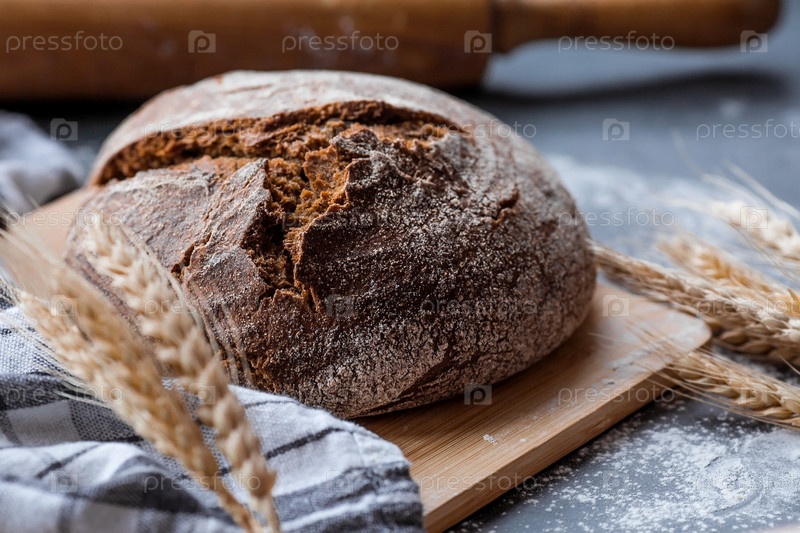 Свежий вкусный хлеб крупным планом. Свежеиспеченный хлеб на закваске с золотой корочкой на деревянной доске. Контекст пекарни с вкусным хлебом. Кондитерские изделия