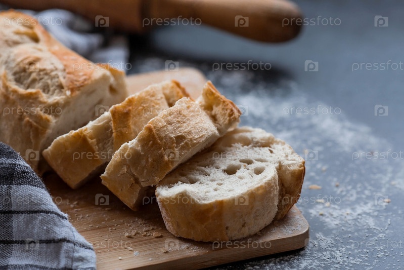 Свежий вкусный хлеб, деревянная скалка, яйца и крупный план муки. Свежеиспеченный багет с золотистой корочкой. Контекст пекарни с вкусным хлебом. Кондитерские изделия