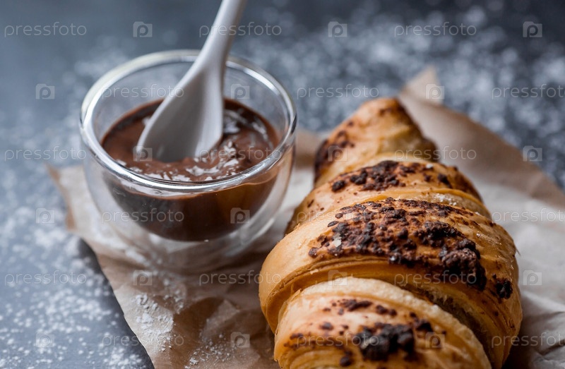 Вкусные свежеиспеченные круассаны с шоколадом на темном фоне. Французский завтрак. Вкусная выпечка крупным планом. Контекст пекарни с вкусным хлебом. Кондитерские изделия