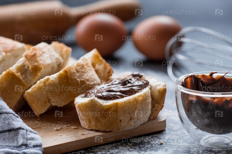Вкусный свежеиспеченный багет с шоколадом на темном фоне. Французский завтрак. Вкусная выпечка крупным планом. Контекст пекарни с вкусным хлебом. Кондитерские изделия