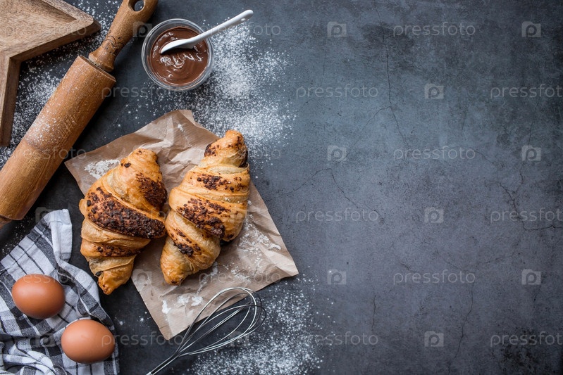 Вкусные свежеиспеченные круассаны с шоколадом на темном фоне. Французский завтрак. Вкусная выпечка крупным планом. Контекст пекарни с вкусным хлебом. Кондитерские изделия