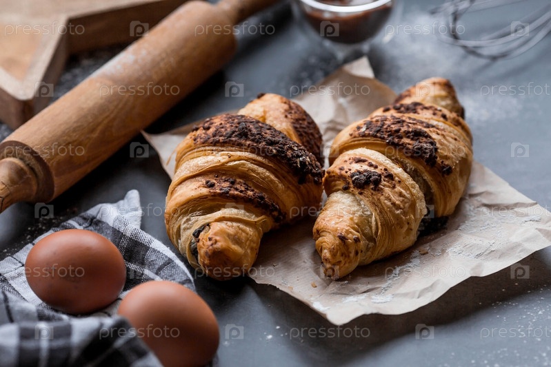 Вкусные свежеиспеченные круассаны с шоколадом на темном фоне. Французский завтрак. Вкусная выпечка крупным планом. Контекст пекарни с вкусным хлебом. Кондитерские изделия