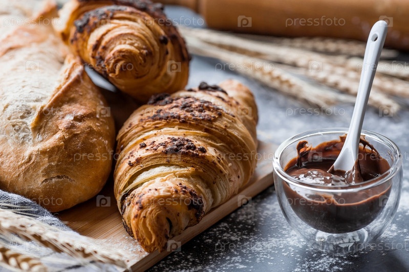 Вкусные свежеиспеченные круассаны с шоколадом на темном фоне. Французский завтрак. Вкусная выпечка крупным планом. Контекст пекарни с вкусным хлебом. Кондитерские изделия