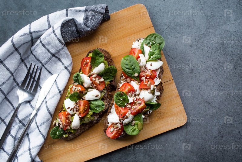Брускетта (бутерброды) с помидорами черри, сыром моцарелла и зеленью на разделочной доске на темном фоне. Традиционная итальянская закуска