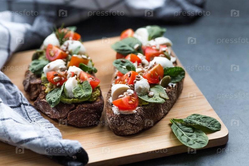 Брускетта (бутерброды) с помидорами черри, сыром моцарелла и зеленью на разделочной доске на темном фоне. Традиционная итальянская закуска