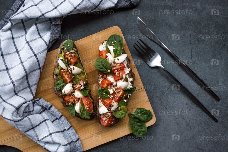 Брускетта (бутерброды) с помидорами черри, сыром моцарелла и зеленью на разделочной доске на темном фоне. Традиционная итальянская закуска