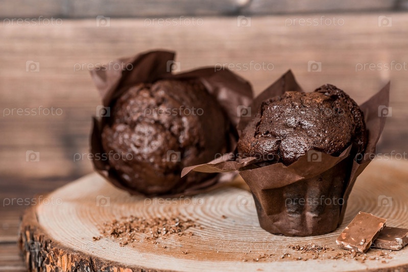Вкусные свежеиспеченные шоколадные кексы на деревянном фоне. Вкусный кекс крупным планом. Контекст пекарни с выпечкой. Кондитерские изделия