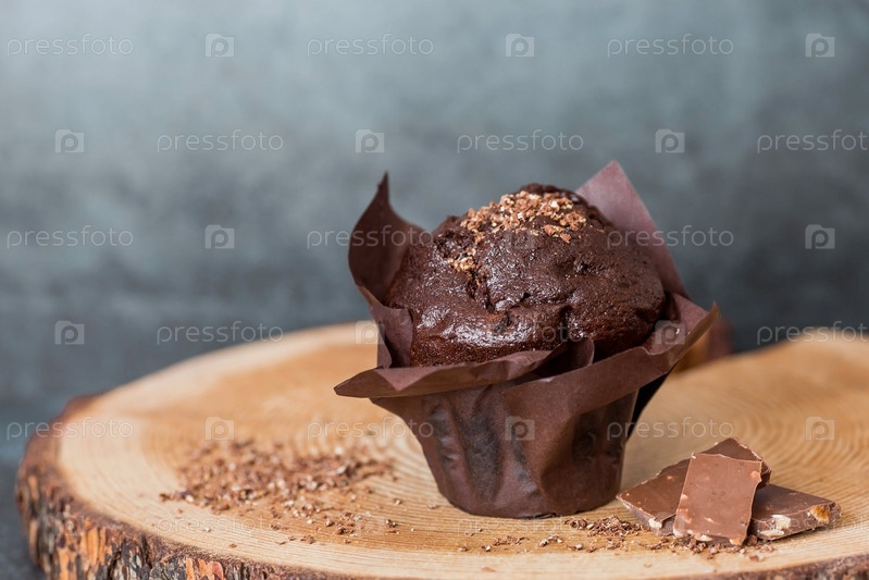 Вкусные свежеиспеченные шоколадные кексы на темном фоне. Вкусный кекс крупным планом. Контекст пекарни с выпечкой. Кондитерские изделия