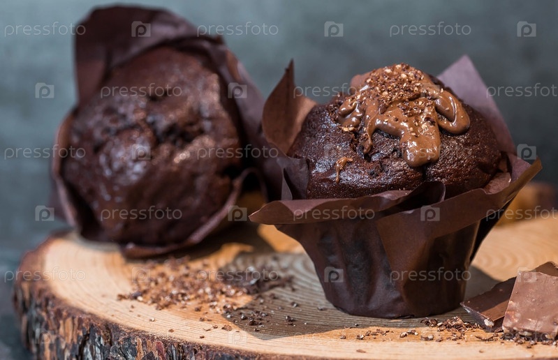 Вкусные свежеиспеченные шоколадные кексы на темном фоне. Вкусный кекс крупным планом. Контекст пекарни с выпечкой. Кондитерские изделия