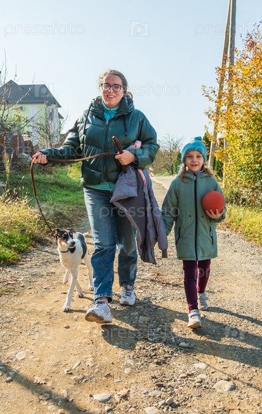 Мать и дочь в куртках ведут собаку на поводке. Женщина, ребенок и собака в сельской местности. Концепция счастливой семьи