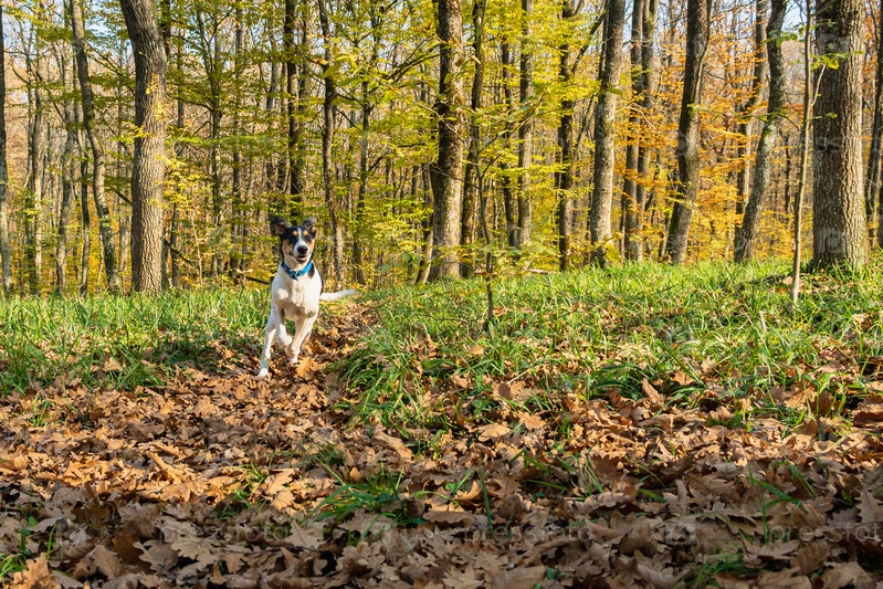 Молодая собака в осеннем лесу. Собака на зеленой траве с листвой. Стволы деревьев на заднем плане