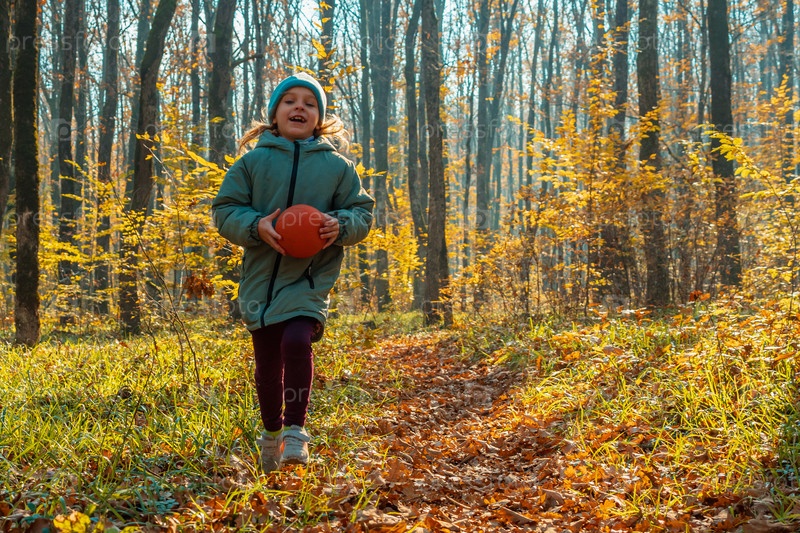 Радостная девочка в куртке и кепке с мячом в руках бежит по осеннему лесу. На заднем плане зеленая трава, желтые листья и стволы деревьев. Концепция счастливого детства