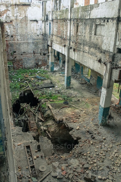 Заброшенный завод с обрушившимся полом. Облупившиеся кирпичные стены, деревянный и металлический мусор на земле. Концепция упадка экономики