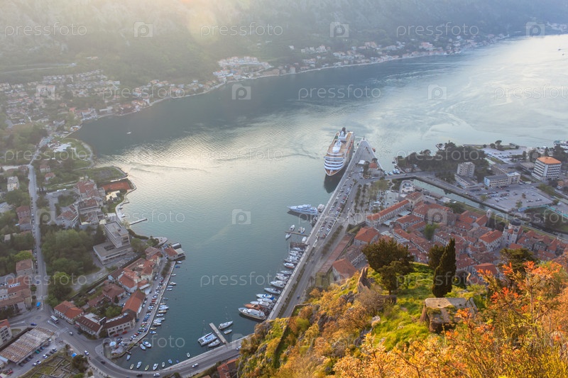 Вид сверху на Боко-Которский залив на закате. Дома с красной черепицей, лодки, катера и круизный лайнер. Концепция туризма в Черногории