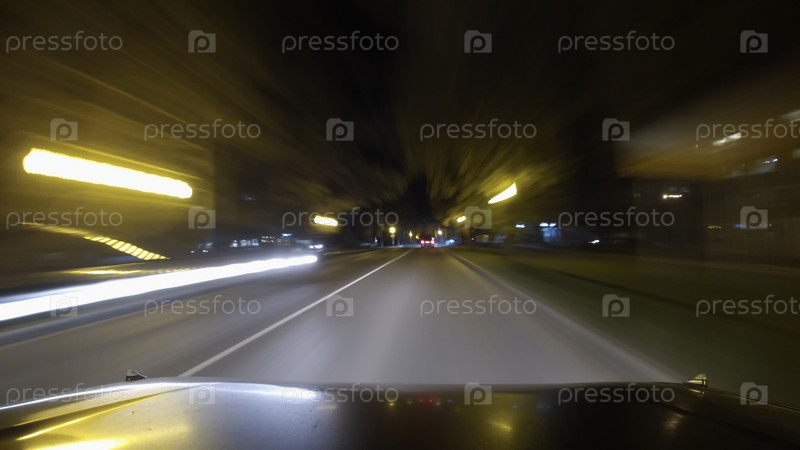 Движение автомобиля по узкой улице города ночью. Впереди едет машина. Размытое изображение автомобильных фар, деревьев и огней по краям дороги