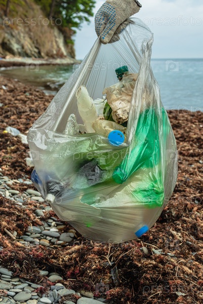 Полный мешок собранных пластиковых бутылок на берегу моря. На заднем плане каменистый пляж с водорослями и морем. Экоактивист очищает берег от загрязнений. Концепция заботы о природе