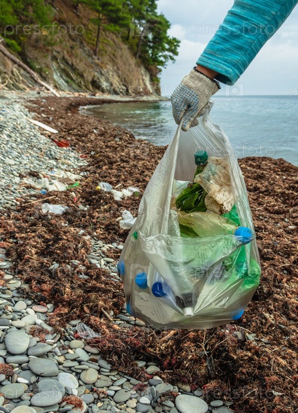 Девушка-волонтер держит в руке мешок с пластиковым мусором. На заднем плане каменный пляж с водорослями и остатками мусора. Экоактивист очищает берег от загрязнений
