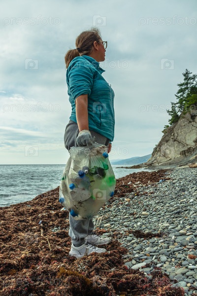 Кавказская женщина-волонтер стоит на пляже с мешком, полным пластикового мусора. На заднем плане море и горы. Экоактивист очищает берег от загрязнений