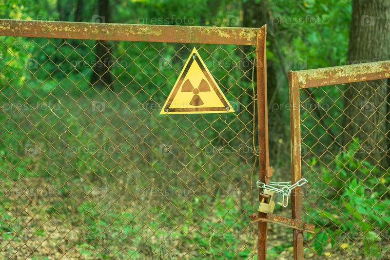 Знак радиации, привязанный проволокой к решетке железных ворот. Створки ворот обмотаны цепью и замком. На заднем плане стволы деревьев и зеленый лес