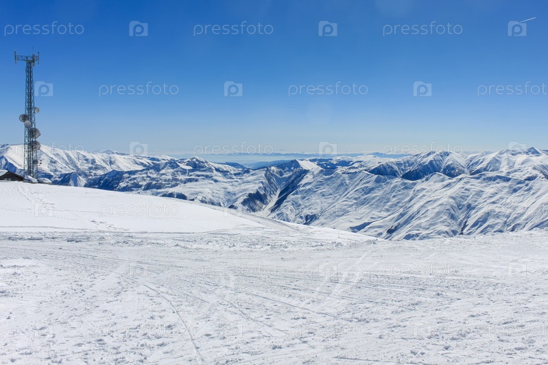 Вид с горнолыжного склона на телекоммуникационную башню и горные снежные вершины. На заднем плане чистое голубое небо
