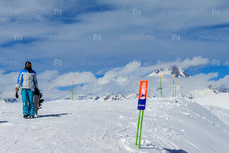 Девушка со сноубордом в руке стоит одна на горнолыжном склоне. Перед ней знак с надписью «Опасность лавины». На заднем плане голубое небо и горные вершины в облаках