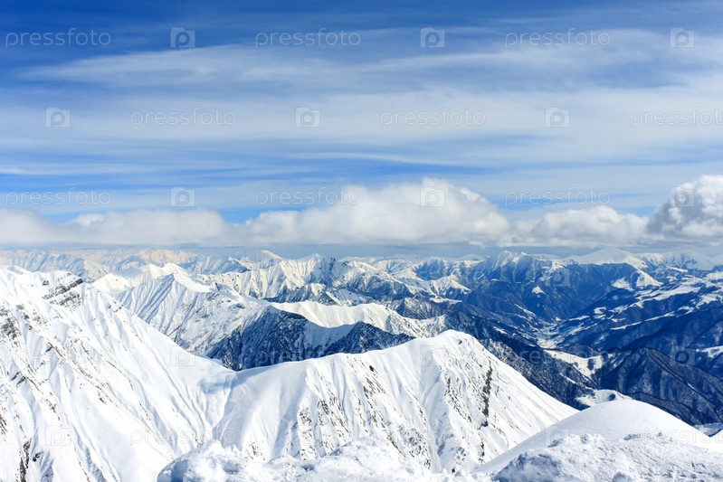 Вид на заснеженные горные вершины, над которыми плывут облака. На заднем фоне голубое облачное небо