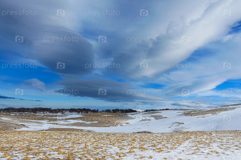 Зимний горный пейзаж. Красивые необычные облака в голубом небе. Под ними снег и желтая трава. Солнечный, морозный день