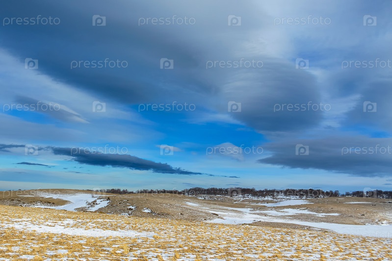 Красивые облака необычной формы на голубом небе. Снег и желтая трава внизу. Зимний горный пейзаж