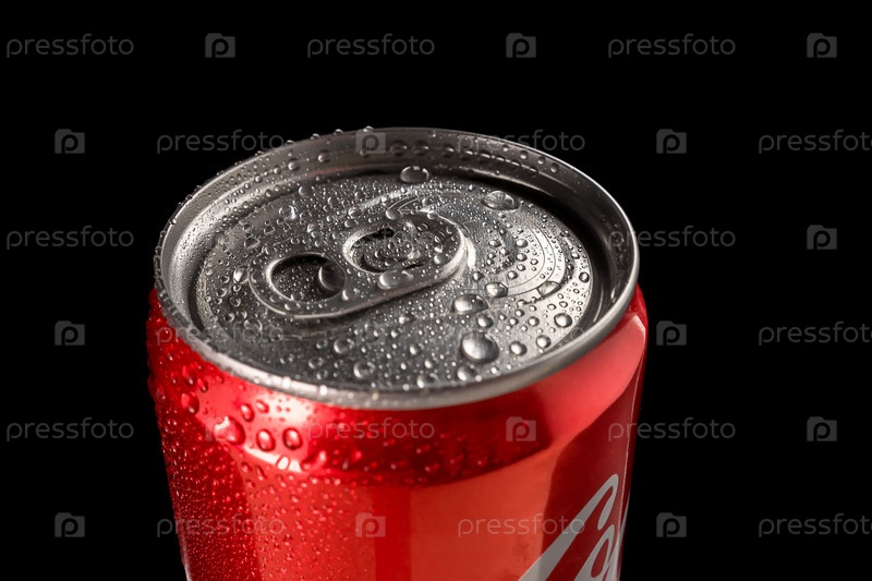 Красная алюминиевая банка с каплями воды на черном фоне. Крупный план, вид сверху