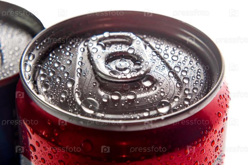 Крупный план капель воды на алюминиевых банках сладкого напитка. Белый фон. Вид сверху