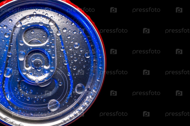Вид сверху на красную закрытую алюминиевую банку с каплями воды на черном фоне. Красивый голубой свет на поверхности металла