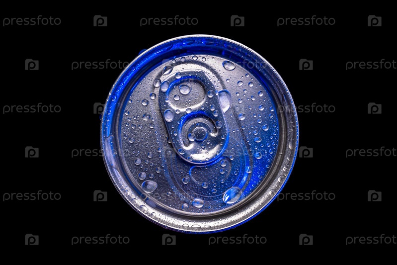 Закрытая алюминиевая банка с каплями воды и синим светом на поверхности. Черный фон
