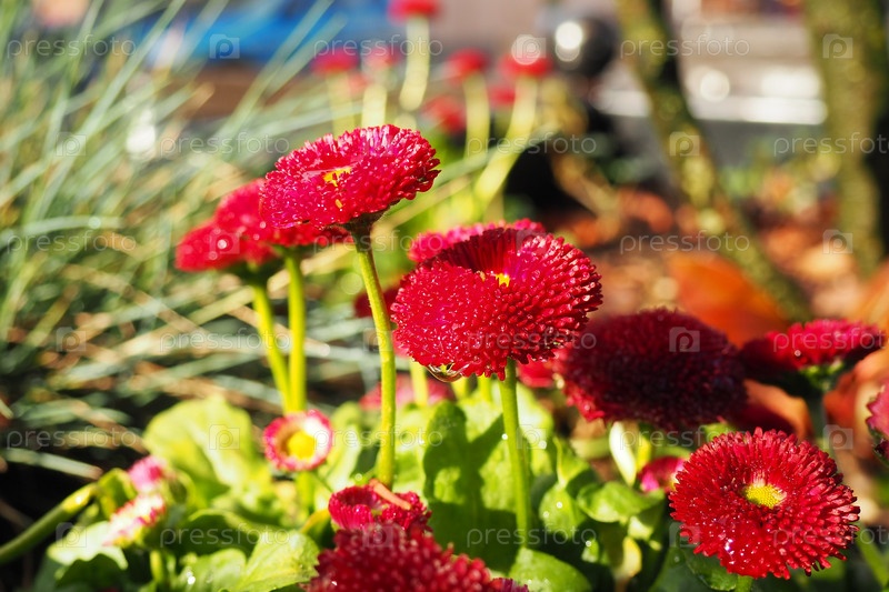 Бордовые махровые многолетние маргаритки на клумбе, садово-огородная гибридная форма. Беллис многолетний. Красные ромашки крупным планом в саду. Цветочная клумба в городском парке. Обыкновенная или английская ромашка, газонная ромашка