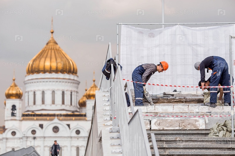 Бригада рабочих укладывает плитку и ремонтирует асфальт на фоне Храма Христа Спасителя в Москве. Строительные работы в городе