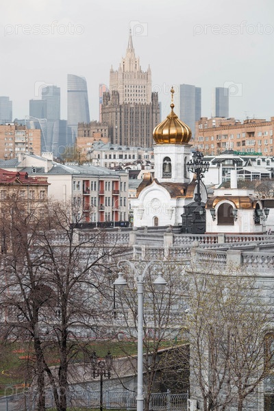 Русский православный собор - часовня храма Христа Спасителя в Москве на фоне Министерства иностранных дел России и города Москвы. Российская Федерация, Москва