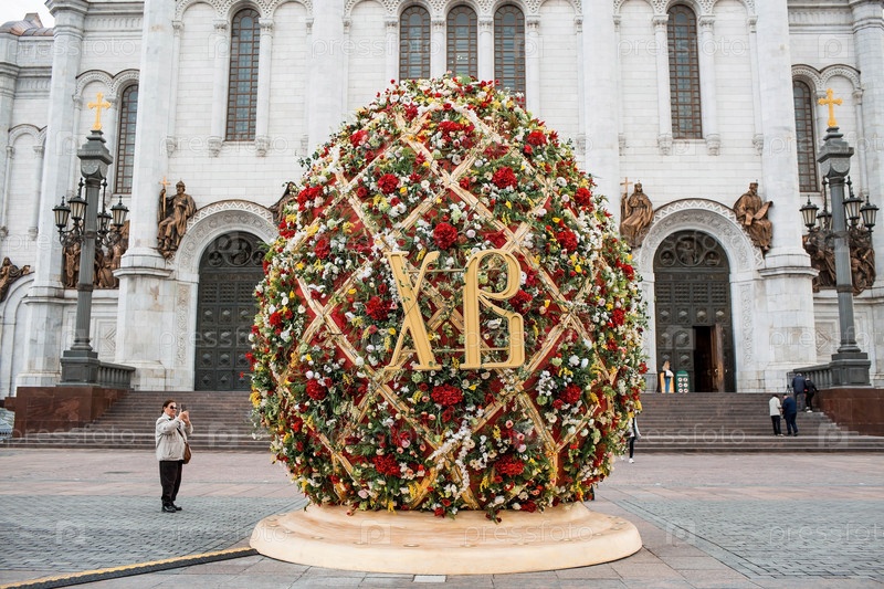 Пасхальная неделя в городе. Фестиваль "Пасхальный дар" Пасхальная инсталляция у Храма Христа Спасителя. Пасхальный декор на улицах города. Московские сезоны. Россия. Москва