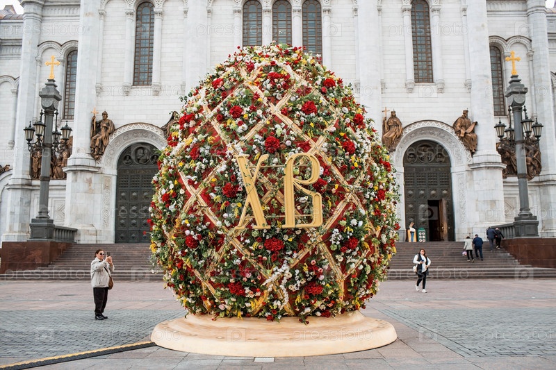 Пасхальная неделя в городе. Фестиваль "Пасхальный дар" Пасхальная инсталляция у Храма Христа Спасителя. Пасхальный декор на улицах города. Московские сезоны. Россия. Москва