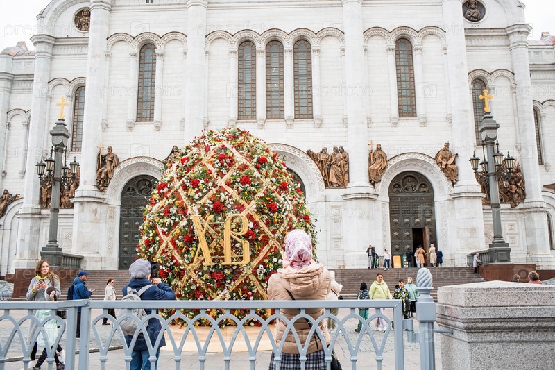 Пасхальная неделя в городе. Фестиваль "Пасхальный дар" Пасхальная инсталляция у Храма Христа Спасителя. Пасхальный декор на улицах города. Московские сезоны. Россия. Москва