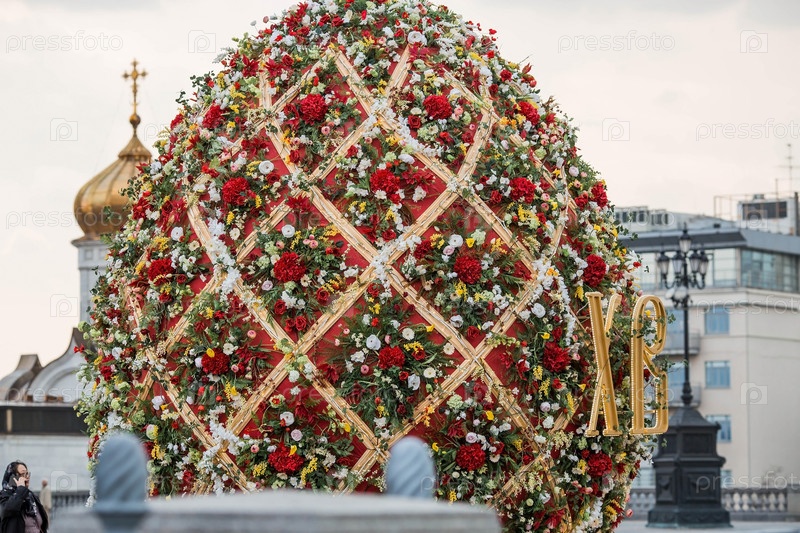 Пасхальная неделя в городе. Фестиваль "Пасхальный дар" Пасхальная инсталляция у Храма Христа Спасителя. Пасхальный декор на улицах города. Московские сезоны. Россия. Москва