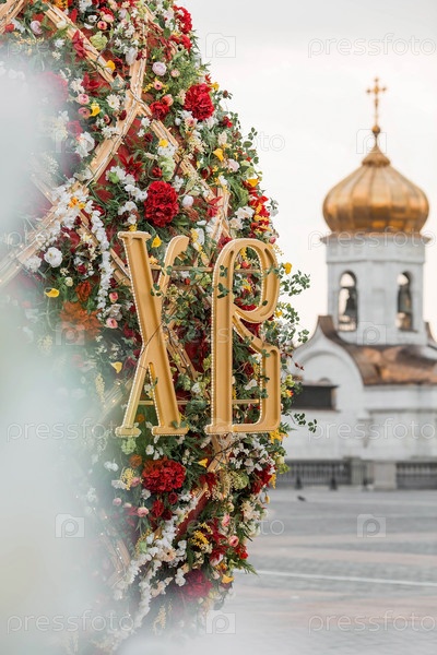 Пасхальная неделя в городе. Фестиваль "Пасхальный дар" Пасхальная инсталляция у Храма Христа Спасителя. Пасхальный декор на улицах города. Московские сезоны. Россия. Москва