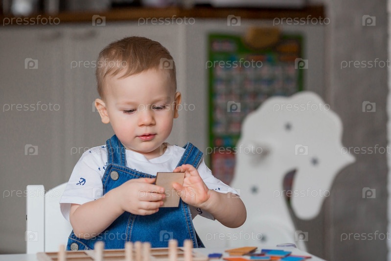 Маленький мальчик играет в обучающие логические игры. Детские деревянные игрушки. Сортировщик. Монтессори для развития ребенка