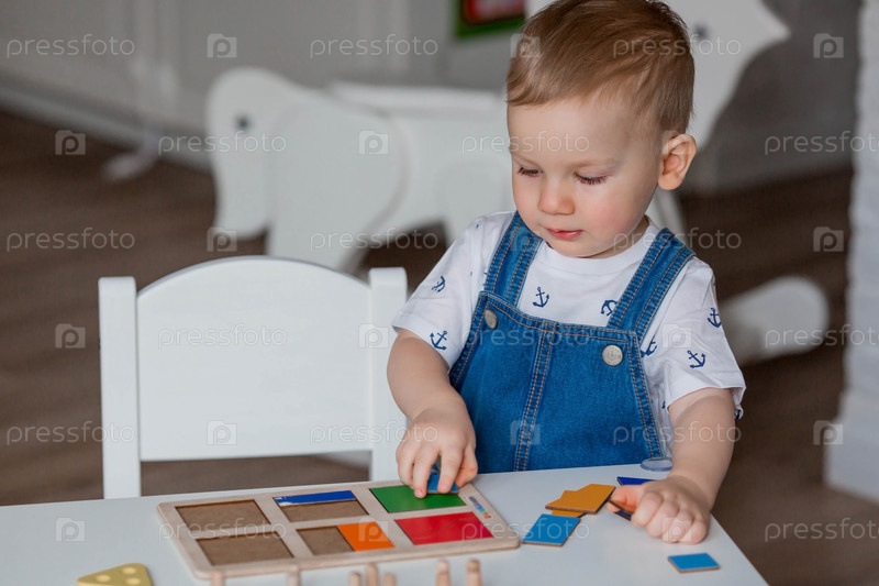 Маленький мальчик играет в обучающие логические игры. Детские деревянные игрушки. Сортировщик. Монтессори для развития ребенка