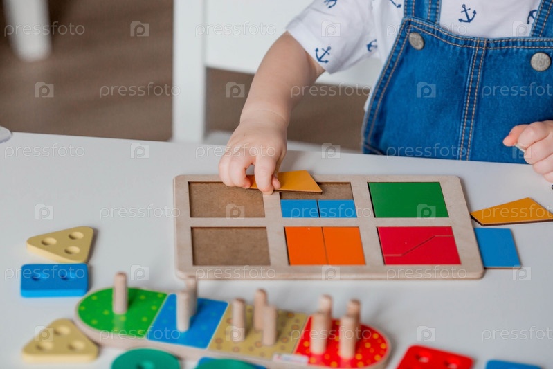 Маленький мальчик играет в обучающие логические игры. Детские деревянные игрушки. Сортировщик. Монтессори для развития ребенка