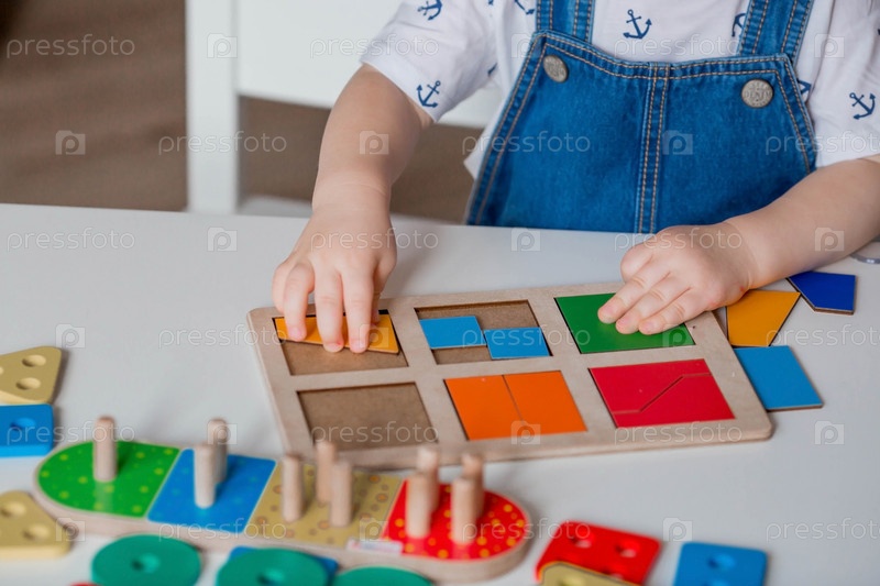 Маленький мальчик играет в обучающие логические игры. Детские деревянные игрушки. Сортировщик. Монтессори для развития ребенка