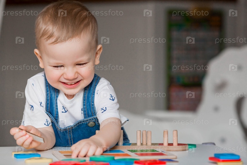 Маленький мальчик играет в обучающие логические игры. Детские деревянные игрушки. Сортировщик. Монтессори для развития ребенка