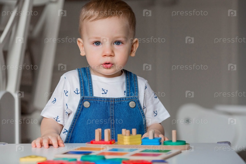 Маленький мальчик играет в обучающие логические игры. Детские деревянные игрушки. Сортировщик. Монтессори для развития ребенка