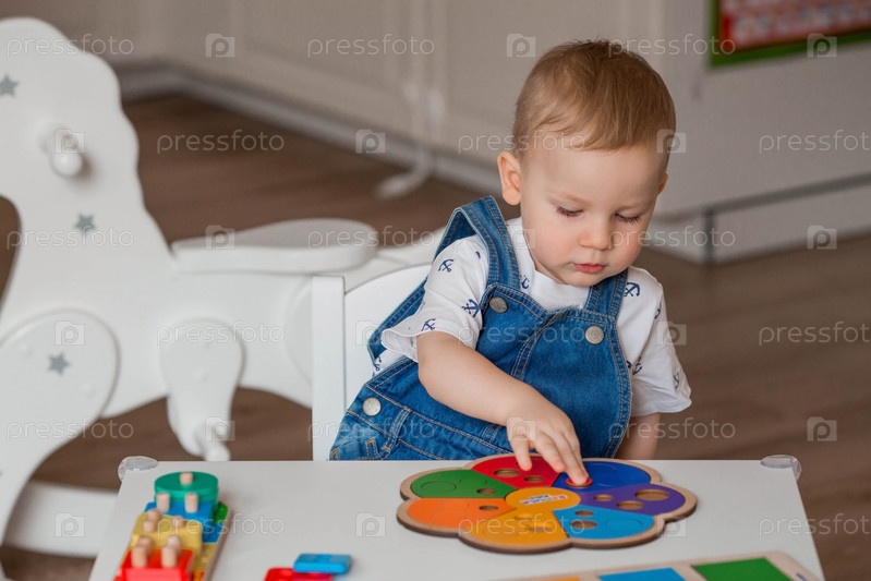 Маленький мальчик играет в обучающие логические игры. Детские деревянные игрушки. Сортировщик. Монтессори для развития ребенка