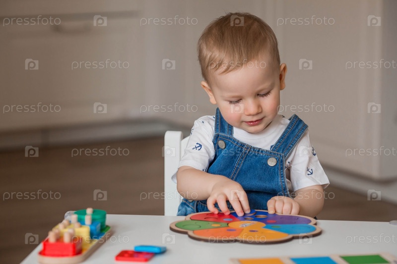 Маленький мальчик играет в обучающие логические игры. Детские деревянные игрушки. Сортировщик. Монтессори для развития ребенка