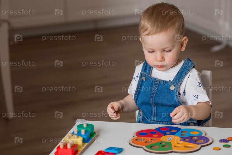 Маленький мальчик играет в обучающие логические игры. Детские деревянные игрушки. Сортировщик. Монтессори для развития ребенка