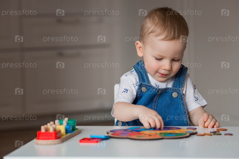 Маленький мальчик играет в обучающие логические игры. Детские деревянные игрушки. Сортировщик. Монтессори для развития ребенка